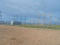 Industrial power plant in the USA, surrounded by open space and natural vegetation. Construction and manufacturing in progress on the gravel surface. Clouds dot the clear daytime sky over the landscape.
