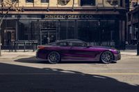 A shiny purple sports car parked in front of a coffee co restaurant on a city street in Toronto. The classic architecture and urban design create a vibrant backdrop. The hard shadows and alloy wheels add to the urban aesthetic.