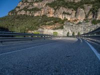 A road in the Pyrenees mountains of Spain, with a clear sky overhead and a hard shadow cast by the mountain. The landscape showcases the natural beauty of the Pyrenees.