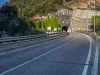 A scenic view of a road in the Pyrenees, Spain. The clear sky casts a hard shadow along the asphalt. The road leads to a tunnel, surrounded by the breathtaking landscape of the Pyrenees mountains.