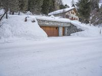 A winter landscape in rural Germany. The snow-covered road leads to a quaint home with a shed in the driveway. The Alps provide a stunning backdrop against the grey sky, creating a serene and peaceful scene.