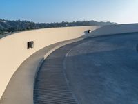 This image showcases a suburban scene in Los Angeles, USA. The picture captures the break of day with a clear sky backdrop. The empty white wall and long curved walkway are the focus of the scene, leading to the entrance of a parking garage. The road and driveway are visible, casting shadows on the ground. This residential area is characterized by its wide parking lot, serving the adjacent buildings. The image portrays a calm and quiet atmosphere, typical of the early morning in the suburbs of Los Angeles.