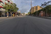 This stock photo showcases a quiet asphalt street in Los Angeles, California, USA. The road is hard to drive around due to its low contrast and motion blur. It is located in a residential area of the city, offering a picturesque view of the neighborhood. The image captures the town during the day, with straight down the road perspective. The yellow lane adds a pop of color to the urban infrastructure. The clouds in the sky complement the cityscape, giving a sense of the downtown atmosphere. The photo showcases the urban design and city life of this vibrant city.