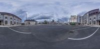 A quiet residential street in the suburbs, with an architectural facade and classic brickwork. The cloudy sky adds a dramatic touch to the monochromatic scene. A bus approaches the building in front.