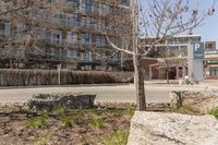 an old bench sits next to a tree and building behind it with many windows on a street corner