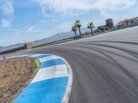 A race track in the USA, with asphalt curves and clear skies. It's a perfect day for racing, with clouds adding drama to the scene. Get ready for some high-speed action!