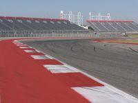This is a photo of a race track with a red asphalt road and a clear sky. The road has lanes and curves, and there is a grandstand and an arena in the background. The race track is used for racing events, both for cars and aviation. It is a popular venue for air travel enthusiasts and aviation events. The photo captures the excitement of racing and the thrill of being at the stadium. The clear sky adds to the overall atmosphere of the image.