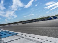 This stock photo features a race track with sharp curves on an asphalt road in the USA. The track is empty, waiting for the race to begin. The clear blue sky with fluffy white clouds adds to the picturesque setting. The image was captured during daytime, with perfect lighting to showcase the race track and its surroundings. It's a dynamic and exciting scene, perfect for illustrating concepts like racing, speed, and competition.