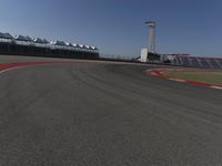 This is an image of a race track with a clear sky overhead. The asphalt road curves around the grandstand and stadium, providing a thrilling racing experience for fans. The fixed link structure and lane markings add to the professional atmosphere of the track. This photo captures the excitement of motorsport and the adrenaline of racing. Whether you're a fan or a participant, this image showcases the exhilarating world of racing on a beautiful day with clear skies.