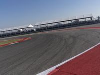 A clear sky sets the backdrop for a curved asphalt racing track. The fixed links and infrastructure create a structure for motorsport enthusiasts. The stadium houses excited spectators as they watch thrilling racing action.