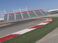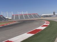 This vibrant photo showcases a race track with red and white striped markings on the ground. The bold colors of the markings stand out against the asphalt, adding a striking touch of color to the scene. The curve of the track, along with the clear sky overhead, creates a captivating backdrop for the action-packed race. In the foreground, the grandstand and stadium can be seen, filled with spectators eagerly awaiting the race. This well-structured racing arena exudes energy and excitement, making it the perfect image to represent the thrill of race day.