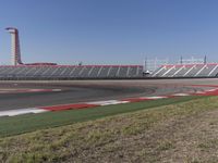This aerial view shows a big empty racetrack near the corner of an airfield. The track is made of asphalt and has distinct red and white stripes. It is a perfect setting for automobile races and aviation events. The clear sky and the day light add to the excitement of the race. On one side, there is a grandstand where spectators can cheer on the racers. This race track resembles a fixed link structure, connecting the world of racing and aviation in one place.