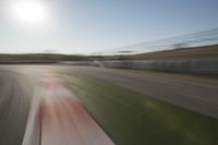 This is an image of a straight road stretching into the distance. The asphalt road reflects the light of the early morning sun, casting a warm glow on the surrounding field. The clear sky and absence of clouds create a serene atmosphere. The motion blur of passing vehicles indicates the high speed of the highway. This photo captures the tranquility of the dawn and the dynamic nature of transportation infrastructure. It evokes a sense of freedom and adventure on the open road.