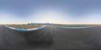 A race track in the USA at dawn. Curved asphalt road ramps provide the perfect race course. The clear sky and bright sunshine cast hard shadows on the open space. A profile of the race track where the sun is visible.