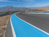 This is an image of a straight road on a race track in the USA. The asphalt curves smoothly ahead, providing a challenging course for racers. The blue sky with fluffy clouds adds a picturesque backdrop to the scene. This photo captures a sunny day at the race track, where drivers compete in high-speed racing events.
