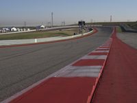 Wide empty road at a racetrack with red and white stripes on the sidewalks and pavements. The clear sky sets the perfect backdrop for high-speed racing action. The infrastructure of the race track is visible in the background.