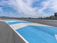 This image captures the excitement of racing on a curved asphalt track in the USA. The race is taking place under a clear sky, with fluffy clouds in the background. The road stretches ahead, representing the thrill and speed of the race. This photo is perfect for illustrating the adrenaline of race car driving in the USA.