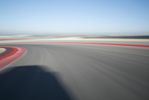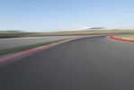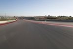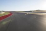 A camera-controlled view of a racing track and field, with the setting sun on a clear blue sky. The straight road leads to a dome-shaped structure. The atmosphere is filled with excitement and anticipation.