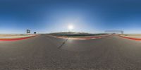 a camera - controlled view of a racing track and field and the setting sun on a clear blue sky