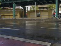 a woman walking down a rain soaked road with an umbrella in the foreground and overpass