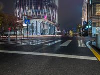 A rainy night in the bustling city of Guangzhou, China. Neon lights illuminate the futuristic architecture and reflect on the wet streets. Streets lined with cafes, shops, and office buildings create a vibrant urban atmosphere.