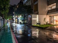 This stock photo captures the essence of city life in Taipei, Taiwan. The rainy sidewalk at night is illuminated by street lights and neon signs from shops and storefronts. The green plants in front add a touch of nature to the urban environment. People can be seen sitting on a bench, while others cross the crosswalk. The artificial light and wet surface of the asphalt create a captivating urban design. Get a glimpse of Taipei City's vibrant nightlife through this image.