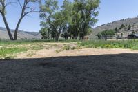 This stock photo depicts a ranch lot in Colorado, specifically in the town of Crested Butte. The image captures a landscape with minimal vegetation and a straight road leading towards the distance. The ground shows little plant life, with a fence bordering the trees. The clear sky above adds to the overall natural environment of this rural area. The photo also showcases various elements of agriculture, such as the open space, barn, shed, and hay. The mountains in the background provide a stunning backdrop to this scene. The dirt, grass, and gravel surface create a rustic feel to the land lot. Overall, this image portrays the vastness and simplicity of the rural countryside in the USA.