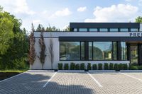 A view of a modern office building in Toronto's business district. The architecture blends perfectly with the surrounding urban design. Clear skies and straight roads add to the charm of this bustling cityscape.