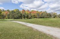 A peaceful landscape in Ontario, Canada. Lush green grass covers the open space with paths leading through the vegetation. The plain is dotted with deciduous trees, creating a scenic view. A perfect spot for recreational activities in Toronto's natural environment.