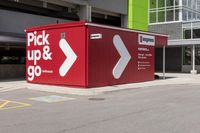 A vibrant city scene in Toronto, Canada. The urban landscape features a parking garage with colorful signage and display advertising. The red containers add a pop of color to the asphalt road surface. A perfect representation of city life in Ontario.