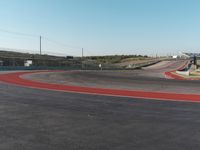 A red curved race track with a red line running along the side. The clear sky creates a picturesque backdrop for the black car racing in the distance. The perfect setting for an exhilarating day of racing.