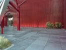 A distorted lens view of a red office building interior with swirl shapes. Futuristic architecture in the heart of Los Angeles. The California dawn casts a unique light on the urban landscape.
