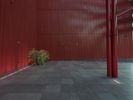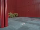 a distorted lens view of an interior of an office building that is red with swirl shapes