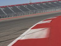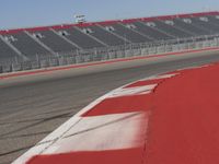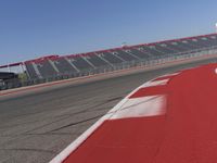 A red race track lined with asphalt and surrounded by infrastructure. Clear skies above with a grandstand full of spectators. The perfect day for high-speed racing and thrilling aviation displays.