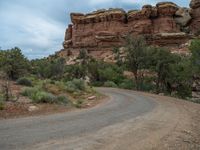 Utah's gloomy landscape featuring red rock canyons under a grey sky. A dirt road winds through the gravel streets, creating a somber ambience. Nature's beauty in a day of mysterious clouds.