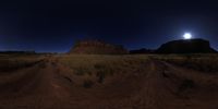 a landscape with dirt roads and the moon setting behind it and a tall hill in the distance