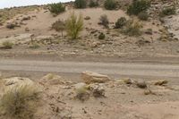 a dirt road with some rocks on the side and hills behind it is an area filled with rocks