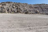 A rugged off-road track in Utah's San Rafael Swell. The red rock formations and badlands create a dramatic landscape. The clear sky above highlights the limestone outcrops and gravel surface.