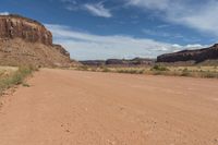 This image captures the rugged beauty of Utah's desert landscape. The red rock mountains and canyons of Canyonlands National Park are highlighted against a clear blue sky. A road cuts through the low-lying desert, surrounded by sandy terrain. The scene evokes a sense of isolation and vastness, embodying the untouched nature of the region. This photo encapsulates the essence of a typical day in the stunning Utah landscape.