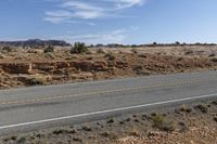 This image showcases the stunning landscape of Utah, USA. The red rock mountains are contrasted by the clear blue sky above. A road winds its way through the desert, surrounded by vegetation and trees. The asphalt road surface glistens under the sunlight. In the distance, the famous Canyonlands and Lake Powell can be seen. The peaceful nature scene is enhanced by the presence of contrails in the sky. It is a perfect representation of a day in the beautiful state of Utah.