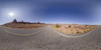 a wide shot is shown of an empty road in the desert with a mountain in the background