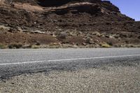 This is an image of a motorcycle driving along a road in the desert of Utah, USA. The landscape features rock formations and desert mountains in the background. The road surface is asphalt, contrasting with the natural bedrock and vegetation surrounding it. The photo captures the natural beauty and rugged terrain of the Canyonlands area, specifically Hite Red Rocks and Lake Powell. This scene represents a typical day in the Utah desert, showcasing the unique combination of nature and man-made infrastructure.