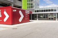 This stock photo features a red shipping container situated at an intersection in the vibrant city of Toronto, Ontario, Canada. The container stands out against the backdrop of a modern building, with a street sign nearby. The urban design of the city, with its asphalt roads and parking deck, adds to the dynamic city life. This image is perfect for architecture, real estate, and advertising projects related to urban product branding and graphic design.