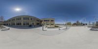 A modern architectural marvel in Toronto's business district. The building's glass facade reflects the outdoor skating park, creating a mesmerizing scene. The clear sky and straight road add to the urban charm.