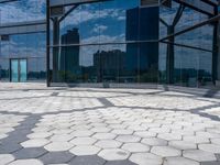 This stock photo captures the beautiful reflection of buildings from inside a glassed building in Taipei, Taiwan. The image showcases the impressive architecture of Taiwan's capital city, highlighting the modern business district and office buildings. The open space and paver surface create a dynamic atmosphere. The photograph was taken during daytime in the bustling city, also known as Formosa, in the Republic of China (Taiwan).