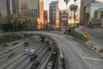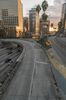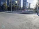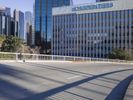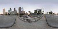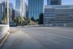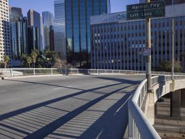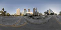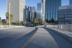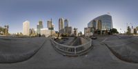 A stunning reflection image of a city street at dawn. The pavement is adorned with multiple circular patterns, while towering skyscrapers create a beautiful backdrop. The clear sky and hard shadows add to the urban ambiance.