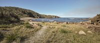 a wide beach with grass near a hill with rocks in the water and trees on one side