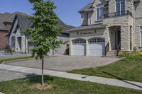 This is an image of a beautiful suburban residential area in Toronto, Canada. The clear sky provides a bright backdrop for the well-maintained houses and buildings. The architecture showcases a mix of brick and stone walls, with charming facades and walkways. The neatly paved driveways and parking garages add to the appeal of the neighborhood. This photo captures the essence of a peaceful suburban life in Toronto, where people can enjoy the comfort and serenity of their homes surrounded by trees and greenery.