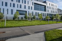 This is an image of a modern high-rise office building in the business district of Toronto, Canada. The architecture showcases a combination of sleek glass windows, concrete surfaces, and urban design. The building is surrounded by a well-maintained land lot with green grass, trees, and vegetation. The image captures a vibrant city scene during the day, with clouds floating overhead. The area is bustling with activity and represents a thriving business and real estate hub. This photo represents the dynamic and modern urban landscape of Toronto's business district.