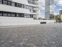 A view of a modern residential building in Berlin, Germany. The building's sleek architecture stands out against the cityscape. It's a bustling day in the business district as people walk along the cobblestone road surrounded by office buildings.